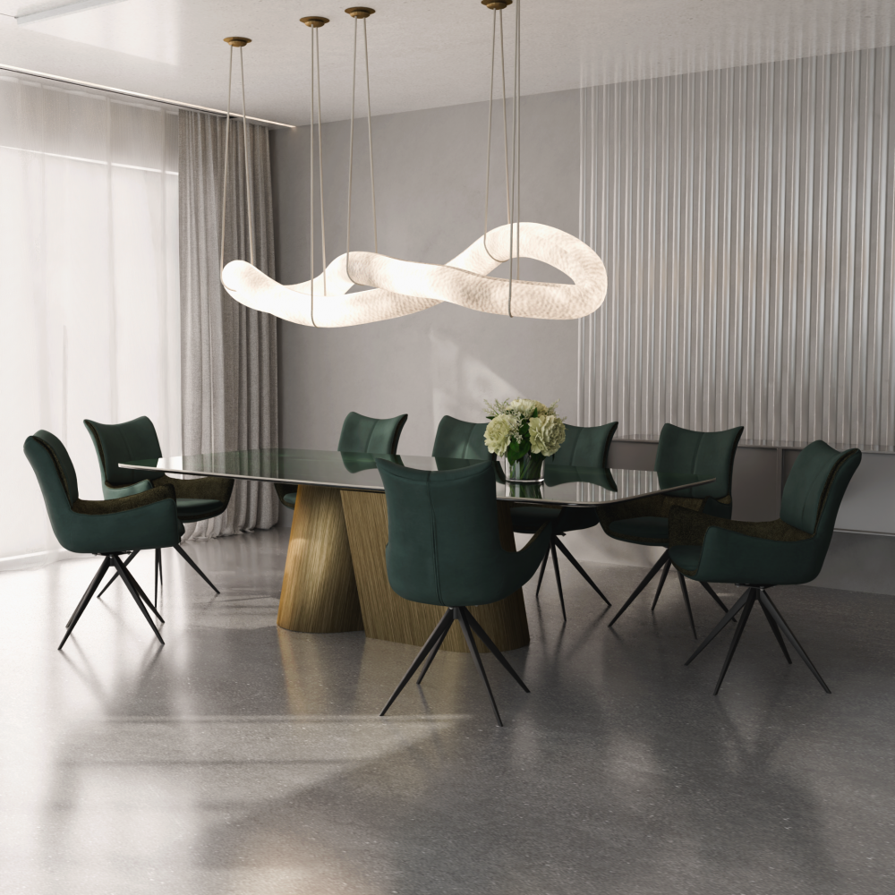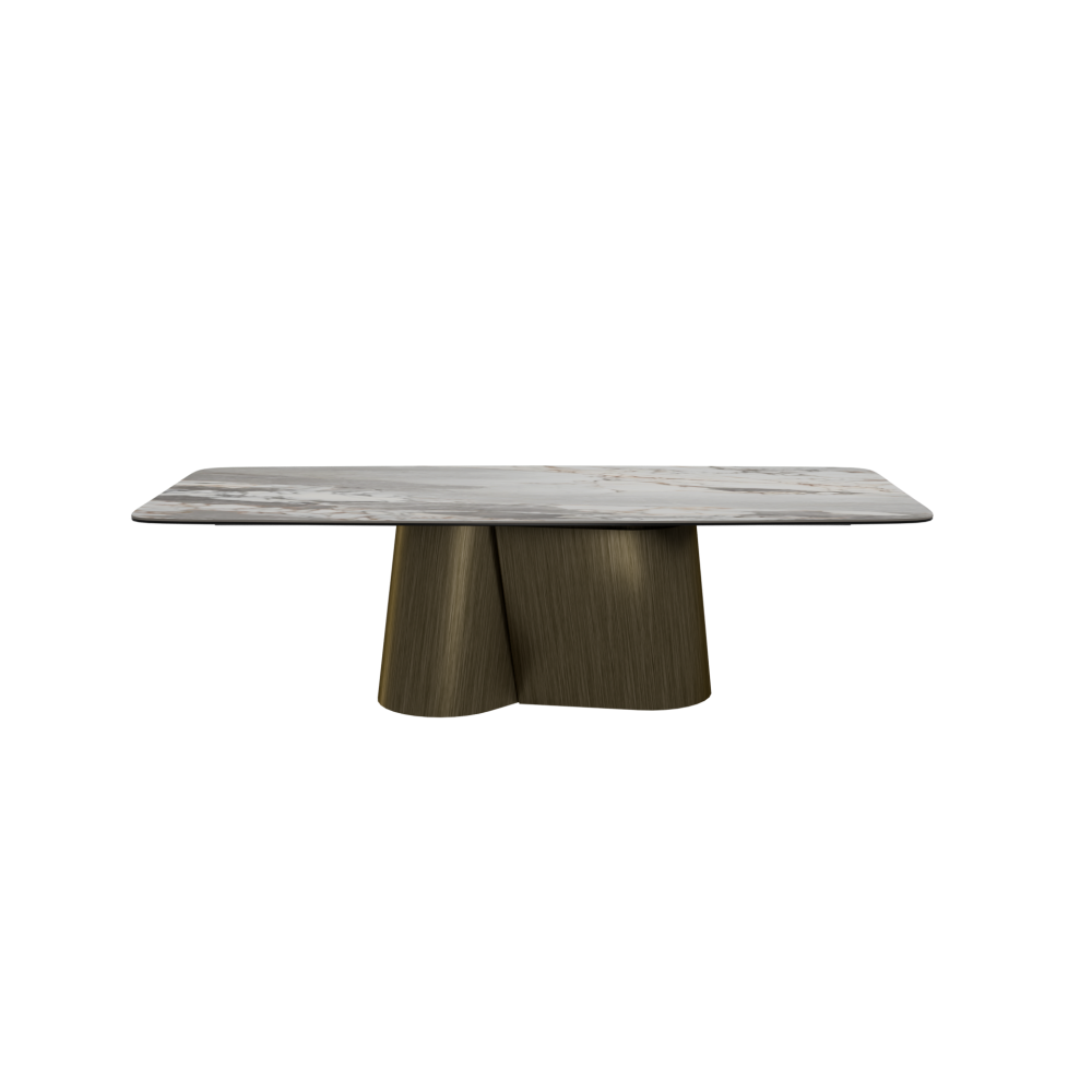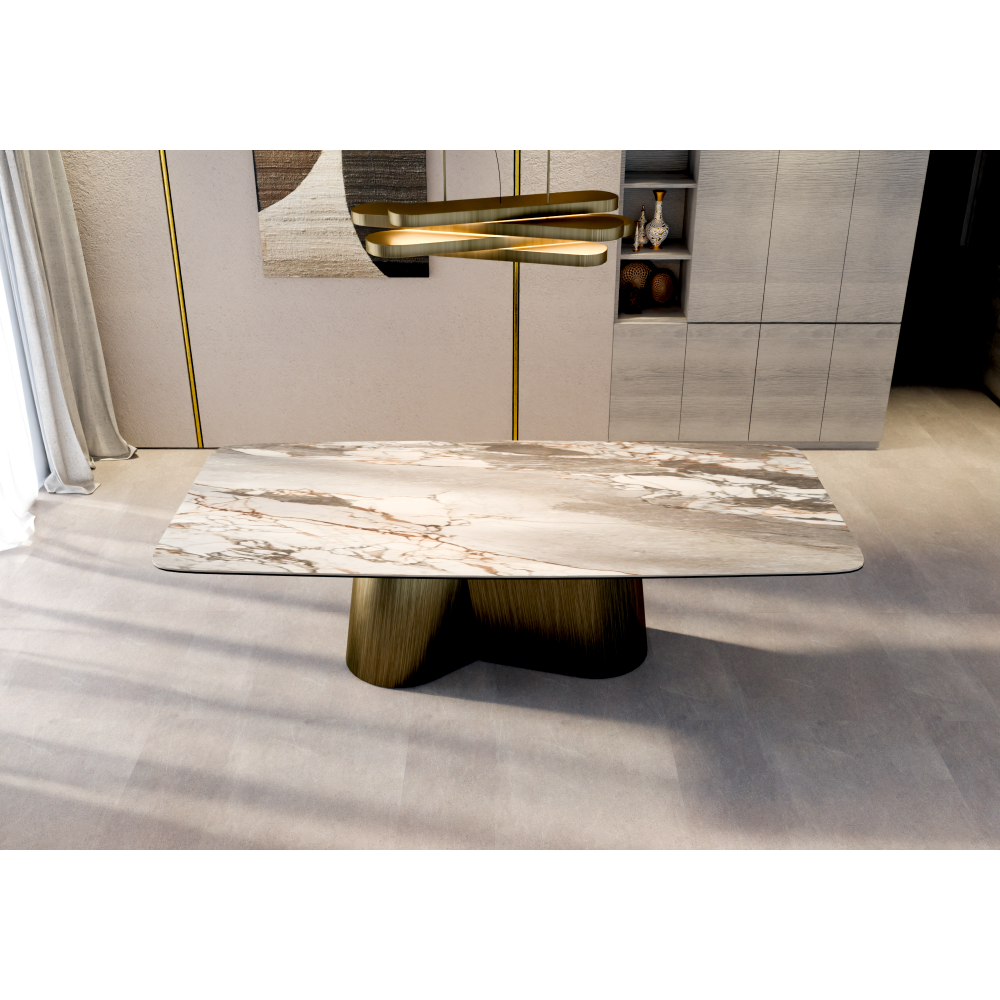 Эксклюзивный стол с уникальной опорой в форме вертикальной восьмерки и премиальной столешницей из испанской керамики.