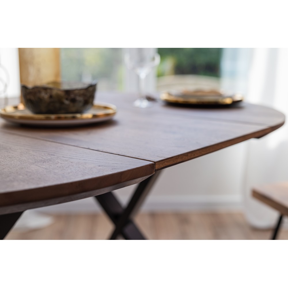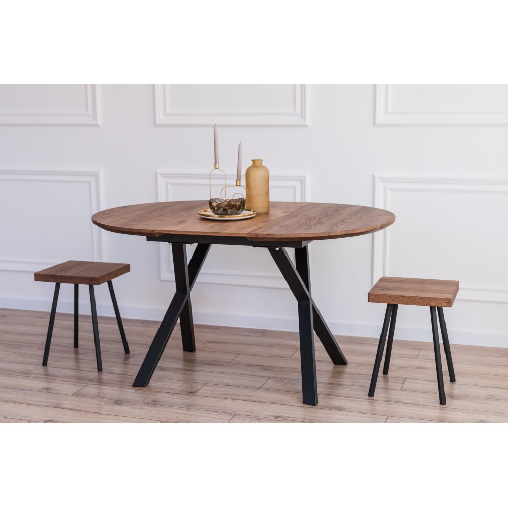 Столешница выполнена из инженерного массива — это основа из массива сосны, покрытая благородным шпоном дуба. Такая конструкция обеспечивает стабильность геометрии (массив не «ведет» со временем) и потрясающую эстетику натурального дуба с его выразительной текстурой. Толщина столешницы — 37 мм, что придает столу основательность и визуальную монументальность.
